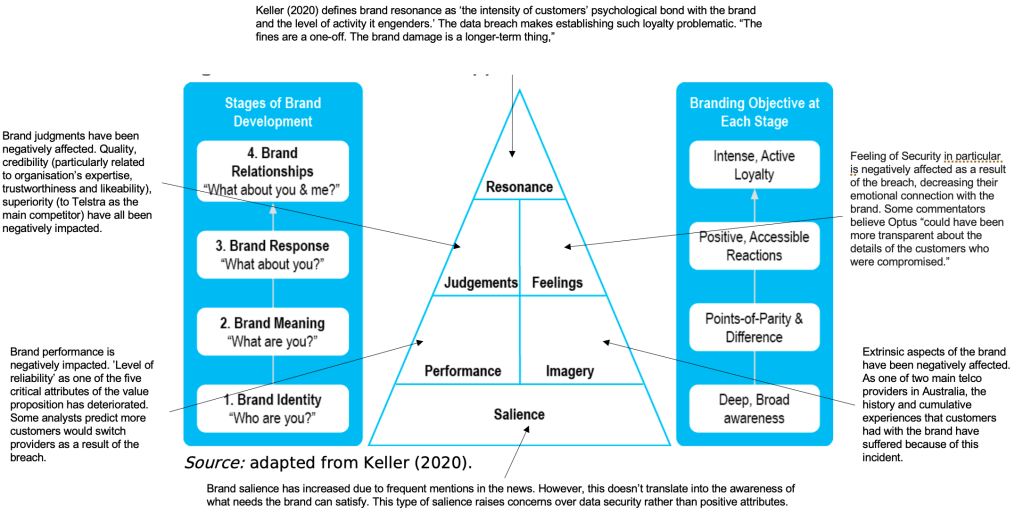 Brand and Product concepts and frameworks, particularly the brand resonance pyramid (Keller 2020) and the growth vector matrix (Ansoff 1957) can be applied in cyber security too. For example, consider last year’s Optus (Australia’s second largest telecommunications company) breach. I put the below diagram together to demonstrate how this framework can be used to evaluate the impact on Optus’ brand.