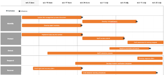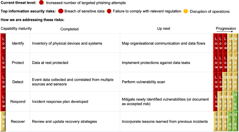 Use the momentum generated by quick wins to tackle harder, more complex security initiatives, like uplifting the detection and response capability and implementing technology solutions. Be mindful not to declare victory too soon, so keep emphasising the sense of urgency by reminding people of the threat landscape and potential risks. This can be achieved by regularly briefing the executives on the current threat profile, key risks and the state of our uplift initiatives (Figure 7).