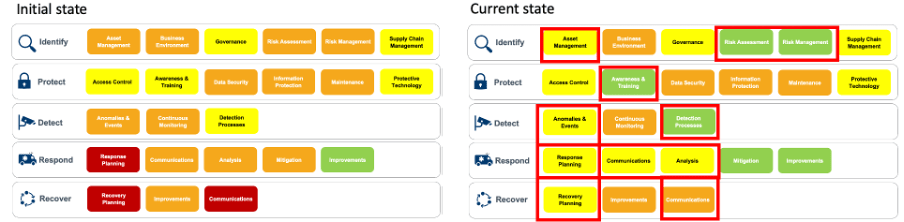 For example, if you updated your risk management process document and launched a new version of the risk dashboard, take your team out for lunch to celebrate. Several weeks into the project, you should be able to demonstrate the progress visually, building on the initial current state assessment in Step 1 (Figure 6).