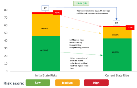 You can also articulate material risk reduction as a result of the implemented quick wins (Figure 8). This demonstrates that cyber capability uplift reduces overall likelihood and impact of potential security incidents and minimises your chances of being hacked.