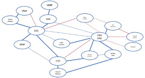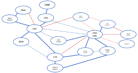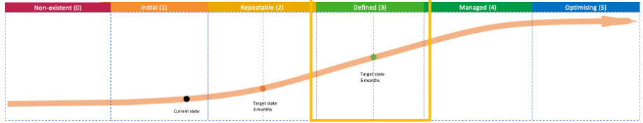 This analysis informs the choice of key people to include in the guiding coalition. For example, you could form it with CEO, CFO, CTO, Head of Delivery and Legal counsel. If possible, request the CEO to sponsor the initiative and dedicate a session during leadership workshops to develop a shared understanding of the current state of your security capability. This also helps build commitment and further develop trust and communication between coalition members. Ideally, all of you share the sense of urgency and feel accountable for improving the security maturity.