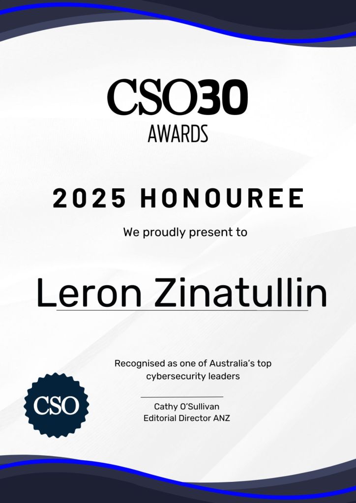 CSO30 Award 2025 Sep 24 2025October 8, 2025 Super proud to be recognised as one of Australia’s top cybersecurity leaders 🏆The award recognises 30 CISOs for demonstrating outstanding leadership and business value.Congratulations to all CIO and CISO honourees. Share this: Click to share on X (Opens in new window) X Click to share on Facebook (Opens in new window) Facebook Like Loading...