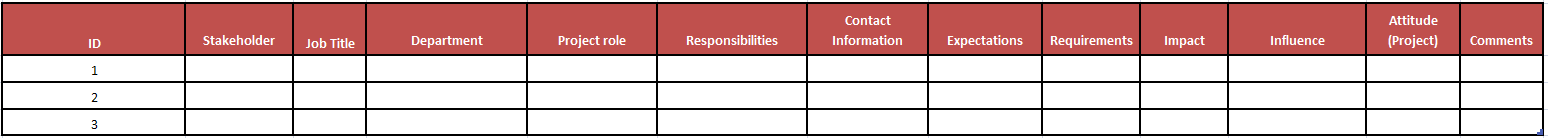 As a first step to such planning, a stakeholder register could be created capturing the contact information, expectations about the project, level of influence, and other characteristics, as in the table below.