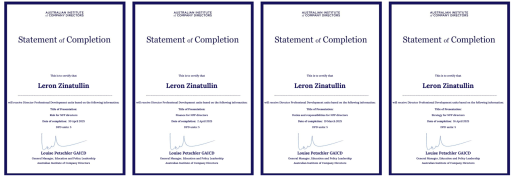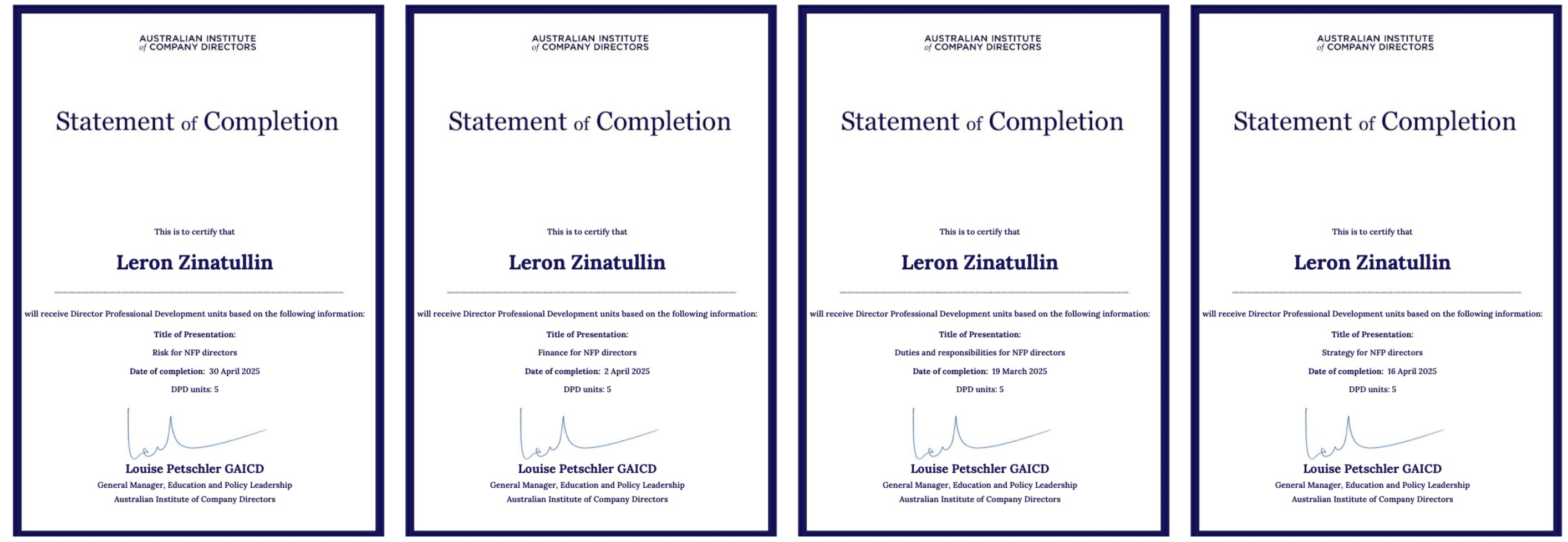 Alongside social impact and governance training from the Australian Institute of Company Directors, tailored to not-for-profit board directors, I spent twelve months observing a purpose-driven board and deepening my understanding of how decisions that matter are made.
