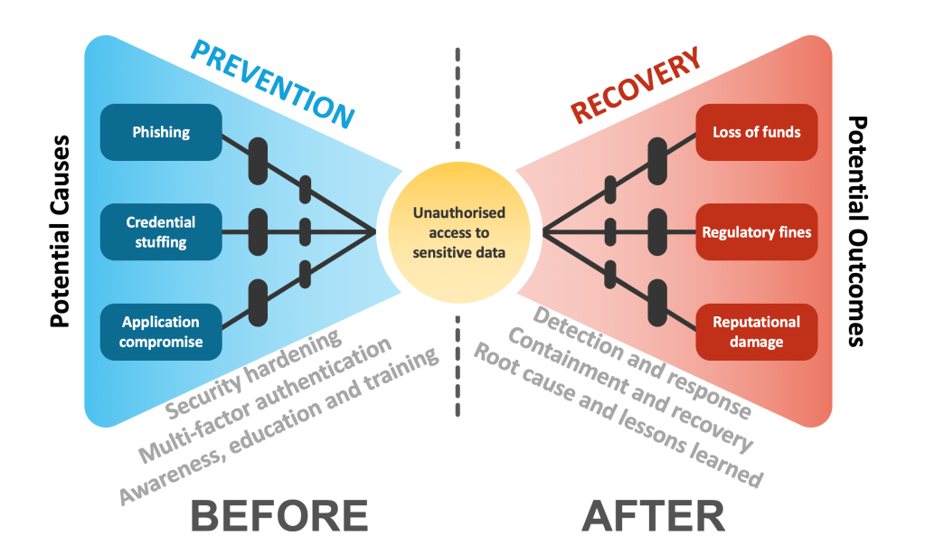 Feel free to refer to my example diagram above where I walk through a sensitive data exposure scenario. For example, it can occur through either a phishing attempt or a credential stuffing attack (supply chain and web application/infrastructure exposure being another vector) leading to a variety of business consequences ranging from a loss of funds to reputational damage. The figure also incorporates potential preventative barriers and recovery controls that are applicable before and after the incident respectively.