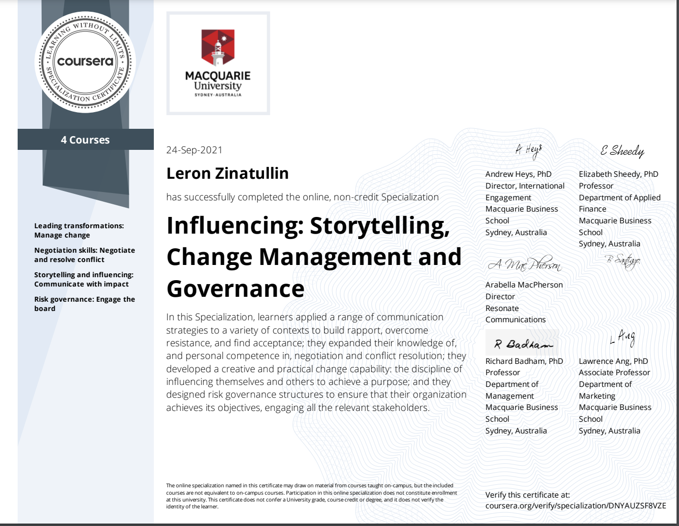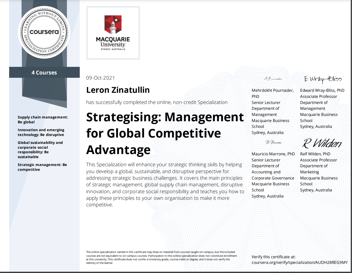 I completed two specialisation tracks on Coursera offered by Macquarie Business School as part of their Global MBA programme. The courses covered a variety topics, including negotiations, change management, storytelling, board engagement, innovation, strategic management, sustainability, supply chains and more.
