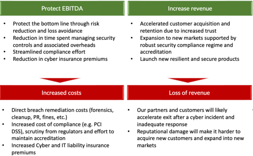 How can security support the business? To answer this question in financial terms, I outline two sides of the story. On one hand, CISOs can demonstrate positive impact on the EBITDA through elevating security capabilities. On the other hand, we can list potential downsides of poor security practices from both revenue and cost perspectives.
